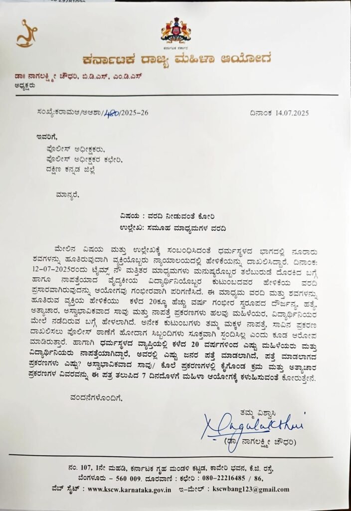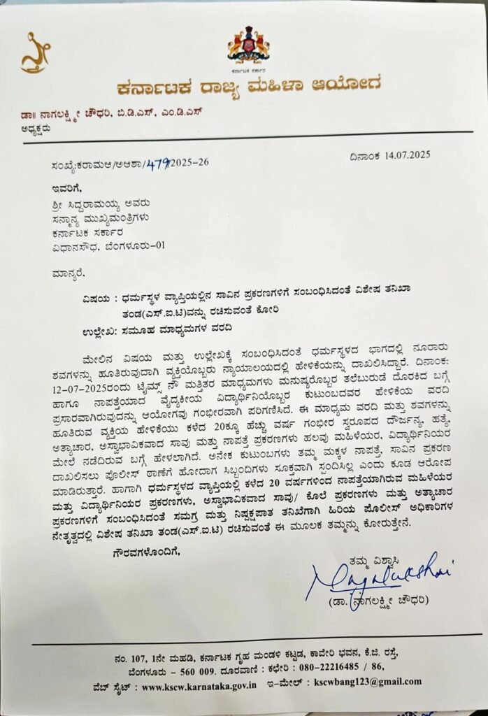 ಧರ್ಮಸ್ಥಳ ವ್ಯಾಪ್ತಿಯ ಕಾಡುಗಳಲ್ಲಿ ಸಾವಿನ ಪ್ರಕರಣಕ್ಕೆ ಸಂಬಂಧಿಸಿದಂತೆ ಸಿಎಂ ಸಿದ್ದರಾಮಯ್ಯನವರಿಗೆ ರಾಜ್ಯ ಮಹಿಳಾ ಆಯೋಗದ ಅಧ್ಯಕ್ಷೆ ನಾಗಲಕ್ಷ್ಮೀ ಚೌಧರಿರವರು ಪತ್ರ ಬರೆದಿದ್ದಾರೆ. ಜೊತೆಗೆ ದಕ್ಷಿಣ ಕನ್ನಡ ಎಸ್ ಪಿ ರವರಿಗೂ ಸಹ ಪತ್ರ ಬರೆದಿದ್ದಾರೆ.