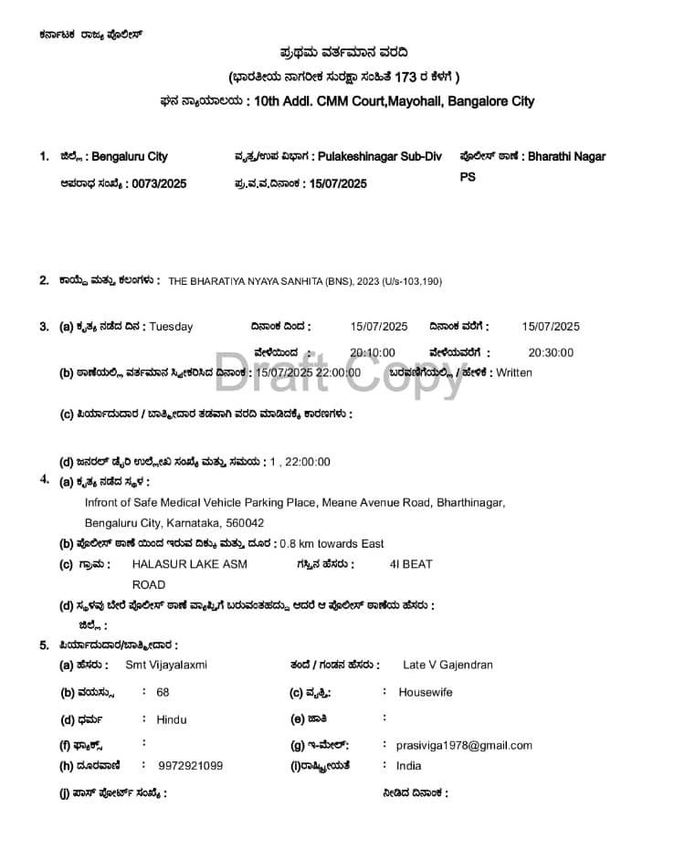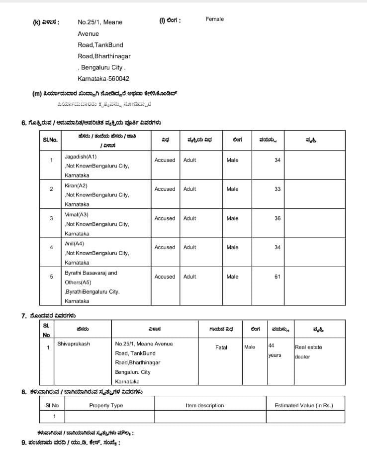ಪ್ರಕರಣದಲ್ಲಿ ಎ೧ ಜಗದೀಶ್, ಎ೨ ಕಿರಣ್, ಎ೩ ವಿಮಲ್, ಎ೪ ಅನಿಲ್, ಎ೫ ಬೈರತಿ ಬಸವರಾಜ್ ರನ್ನು ಮಾಡಲಾಗಿದೆ.