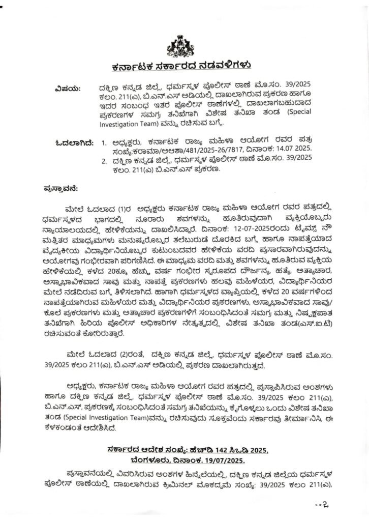 ಅಂತೂ ಧರ್ಮಸ್ಥಳದಲ್ಲಿ ಮಹಿಳೆಯರ ಸಾವು ಪ್ರಕರಣವನ್ನು ರಾಜ್ಯ ಸರಕಾರ ಎಸ್ ಐಟಿಗೆ ವಹಿಸಿ ಆದೇಶ ಹೊರಡಿಸಿದ್ದು, ಮಹಿಳೆಯರ ಸಾವಿಗೆ ನ್ಯಾಯ ಸಿಗಬೇಕು ಎಂದು ಹೋರಾಟ ನಡೆಸುತ್ತಿದ್ದ ಹೋರಾಟಗಾರರ ಧ್ವನಿಗೆ ರಾಜ್ಯ ಸರಕಾರ ಸ್ಪಂದಿಸಿದಂತಾಗಿದೆ.