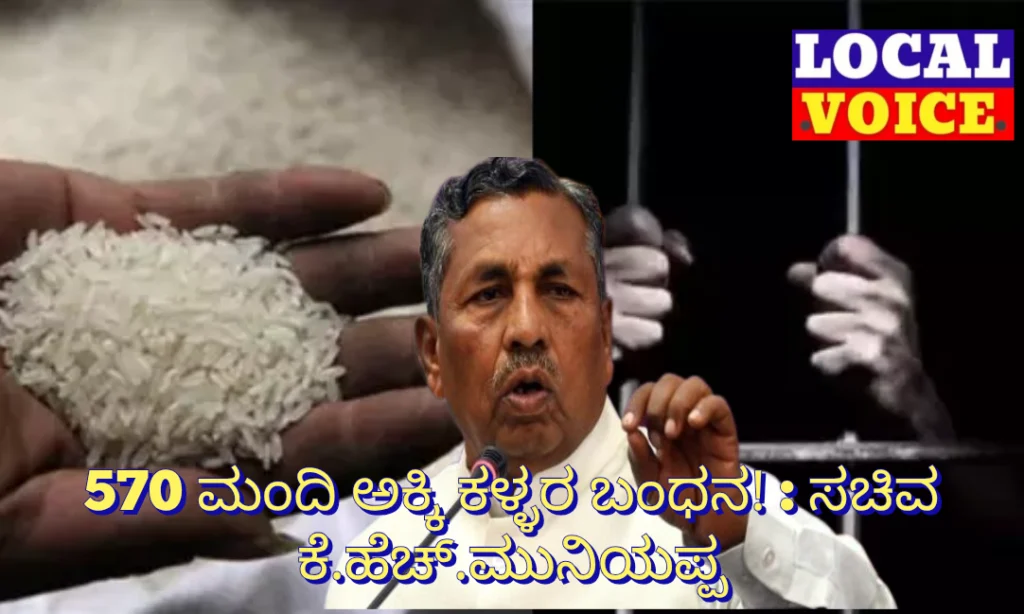 ರಾಜ್ಯದಲ್ಲಿ ಅನ್ನಭಾಗ್ಯ ಅಕ್ಕಿ ಅಕ್ರಮ ಸಂಗ್ರಹ ಮತ್ತು ಮಾರಾಟಕ್ಕೆ ಸಂಬಂಧಿಸಿದಂತೆ ರಾಜ್ಯಾದ್ಯಂತ 570 ಜನರನ್ನು ಬಂಧಿಸಲಾಗಿದೆ ಎಂದು ಆಹಾರ, ನಾಗರಿಕ ಸರಬರಾಜು ಮತ್ತು ಗ್ರಾಹಕ ವ್ಯವಹಾರಗಳ ಹಾಗೂ ಕಾನೂನು ಮಾಪನ ಶಾಸ್ತ್ರ ಇಲಾಖೆ ಸಚಿವ ಕೆ. ಎಚ್. ಮುನಿಯಪ್ಪ ತಿಳಿಸಿದರು.